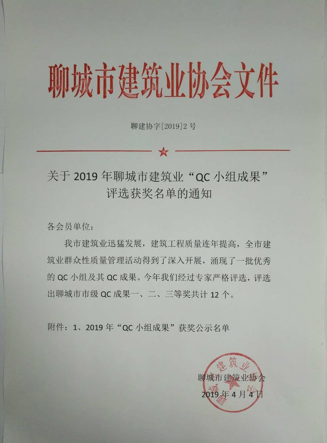 關(guān)于2019年聊城市建筑業(yè)“QC小組成果”評選獲獎名單的通知
