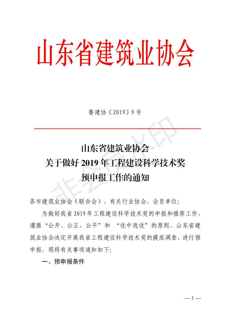 山東省建筑業(yè)協(xié)會關(guān)于做好 2019年工程建設(shè)科學(xué)技術(shù)獎(jiǎng)?lì)A(yù)申報(bào)工作的通知
